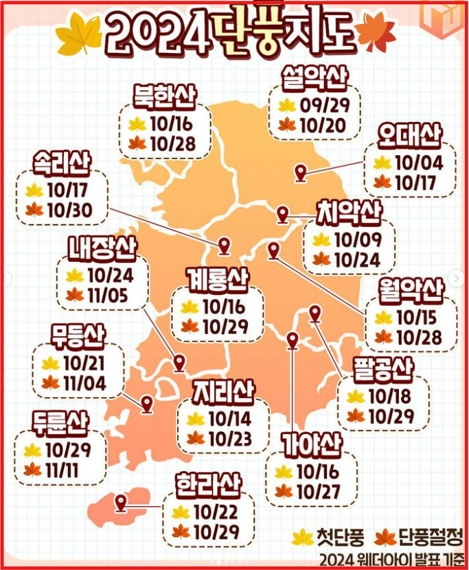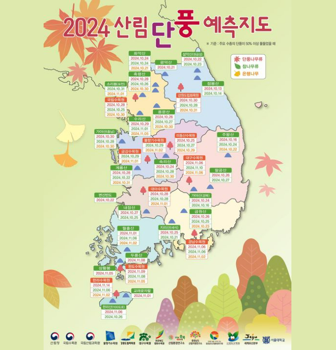 2024년 가을, 우리나라의 아름다운 단풍이 언제 절정에 이를지 많은 이들이 기다리고 있습니다. 이에 따라 산림청은 올해 단풍이 언제 절정에 이를지 알려주는 '산림단풍 예측지도'를 발표했습니다. 올해는 특히 6월부터 8월까지 기온이 높았던 영향으로, 단풍이 예년보다 조금 늦어질 것이라고 합니다. 산림청은 전국의 다양한 지점에서 관측된 데이터를 기반으로 이번 예측지도를 만들어냈습니다.
