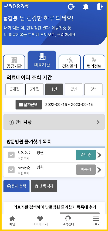 또한 ‘나의건강기록’ 앱은 사용자가 자주 사용하는 기능에 빠르게 접근할 수 있도록 화면을 개인 맞춤형으로 설정할 수 있습니다. 예를 들어, 자주 확인하는 건강 기록이나 알레르기 정보를 한눈에 볼 수 있도록 설정해두면 더욱 편리합니다.