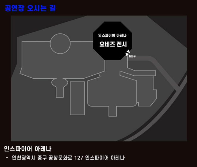 공연이 열리는 인천 인스파이어 아레나는 약 1만 5천 석 규모의 대형 공연장으로, 최첨단 오디오 시스템을 갖추고 있어 음질이 매우 우수합니다. 또한 T자형 무대 등 다양한 형태로 무대를 구성할 수 있어 팬들이 더욱 가까이에서 무대를 즐길 수 있습니다. 공연장은 인천국제공항 제2터미널에서 차로 약 10분 거리에 위치해 접근성도 매우 좋습니다.