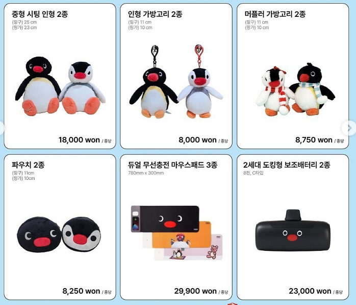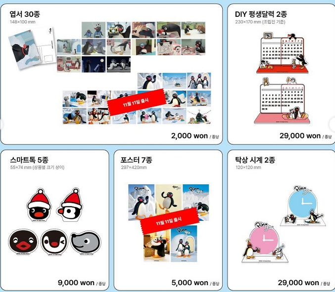 - 의류와 액세서리: 핑구의 사랑스러운 이미지가 담긴 의류와 악세서리는 데일리로 착용하기 좋습니다.